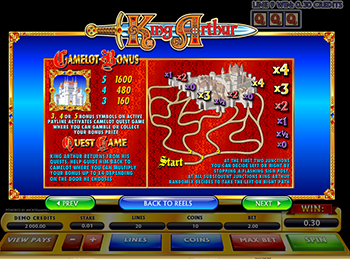 Старый маг Мэрлин может включаться в игру вместо любого символа, кроме призовых. Сам Король Артур участвует в игре на таких же условиях и дополнительно удваивает выигрыш. Собственный выигрыш за редкий символ монарха также составит солидную сумму – 10 000 ставок за 5 символов.